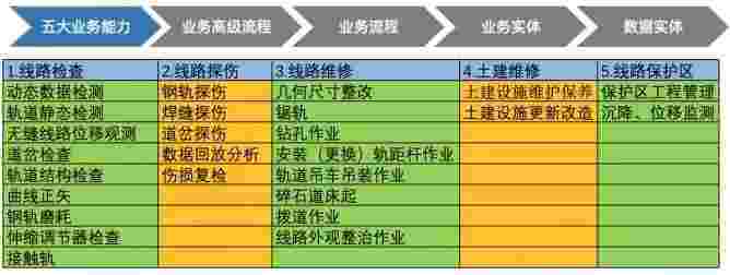 在轨道运维业务中,,我们形成了完整的从业务能力(业务域)-业务流程-业务实体-数据模型的分析梳理过程。。轨道运维业务能力如下图所示::