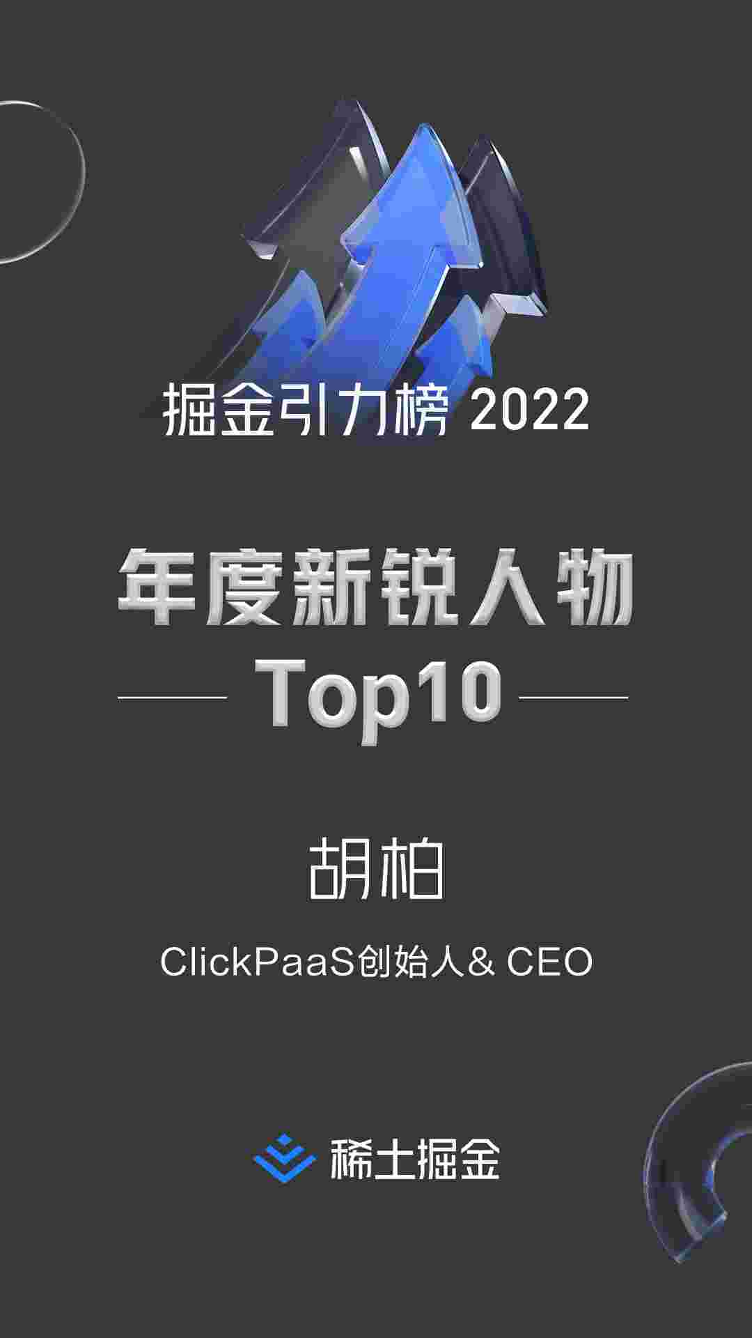 2022年1月6日,,稀土掘金社区第一届「掘金未来大会」成功举办,,,,会上发布了“2022 稀土掘金引力榜 年度新锐人物”榜单,,,,上海爱湃斯科技有限公司(简称沃钱包)创始人及CEO胡柏实力入选年度新锐人物TOP 10。。。